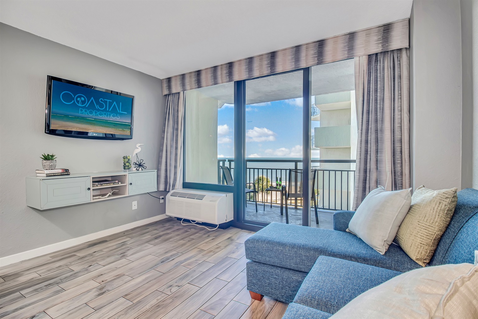 Wake up to the sound of the waves and end your day with sparkling ocean views right from your private balcony. This bright and stylish suite features a king bed plus a comfy Murphy bed, sleeping up to 4 guests with ease. The living room is filled with natural light, creating the perfect spot to relax after a day at the beach. A fully equipped kitchen with a brand-new stainless steel stovetop makes meal prep a breeze, whether it’s a quick breakfast or dinner with the ocean as your backdrop.