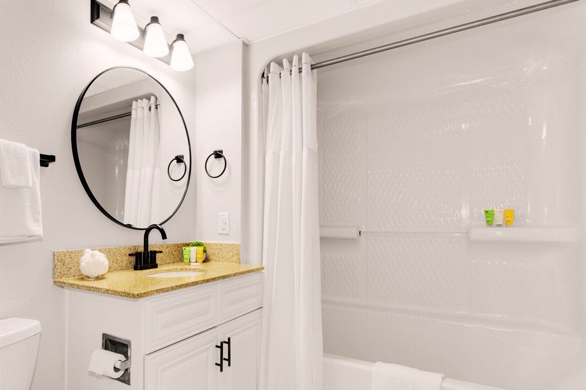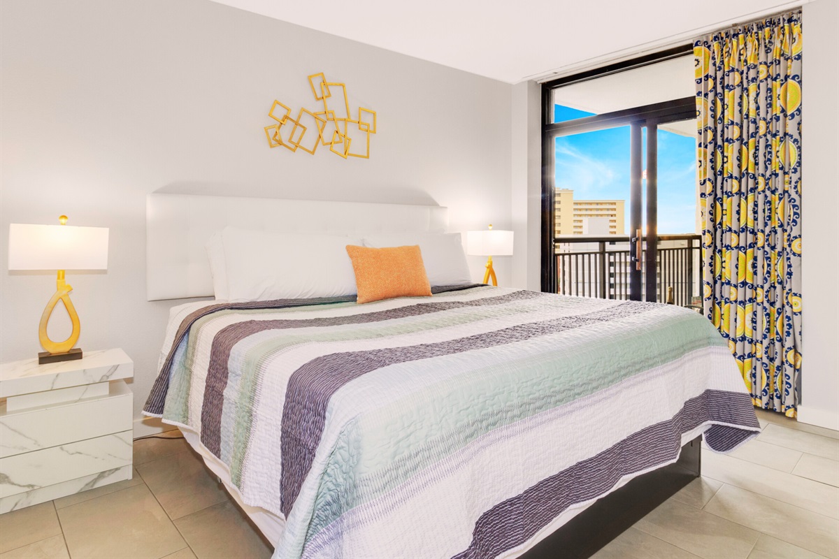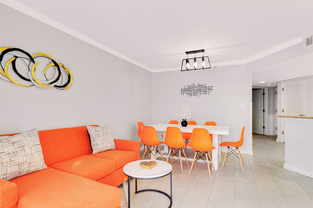 Designed for up to 8 guests, the suite offers both comfort and style with its spacious open layout and stunning angled ocean views of Myrtle Beach’s iconic Golden Mile. The living area features large windows that fill the space with natural light and open directly to a private balcony, your front-row seat to spectacular sunrises over the Atlantic. A plush sleeper sofa provides extra seating and additional sleeping space for larger groups. The fully equipped kitchen makes dining a breeze with everything you need to prepare meals together. Enjoy breakfast at the bar or gather around the dining table for family dinners with a view. Both bedrooms are thoughtfully furnished to ensure a restful stay. The primary suite features a king bed, along with a tub and shower combination. The second bedroom offers two queen beds and easy access to the second full bath. With an in-unit washer and dryer, fresh linens, and hotel-style amenities, every detail has been considered for your convenience.